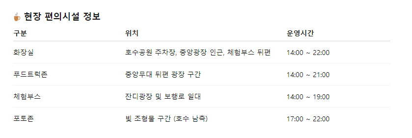 | 11월 1일 이후 ~ 2026년 1월 31일 | 빛 조형물 전시 기간 운영 — 매일 17:00 ~ 22:00 점등, 겨울철 야간 명소로 활용 |