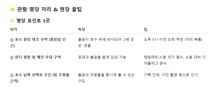 - 호수 중앙 뷰 포인트: 물 위 반영과 함께 불꽃이 물 위에 비치는 장면을 볼 수 있음